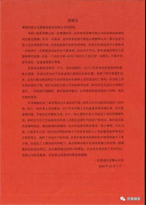 金杯银杯不如甲方的口碑。朱德刚做的虽然都是一些小事,不足为道,但他不怕苦、不怕累的精神得到了村民的称赞。一封表扬信,更是对宗保队员爱岗敬业、尽职尽责的职业素养和敬业精神给予的褒奖和鼓励。