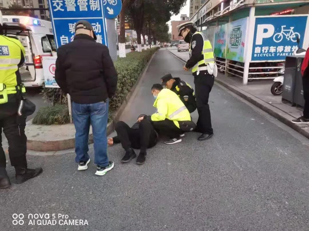 当天16:45,在超峰东路与东湖北路口,发生一起电瓶车和机动车相撞的交通事故,杨晨博刚好巡逻至此,发现一位老人被撞摔倒在地上。
