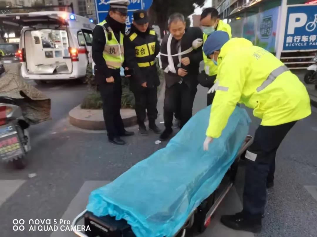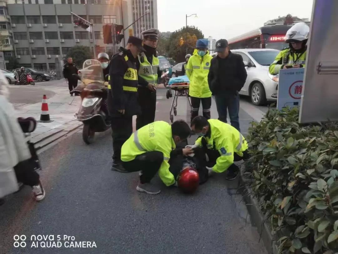 组长张艮振很快赶到事故现场,了解情况后,随即联系到了伤者家属。不一会儿,交警和救护车也赶到现场,杨晨博和张艮振协助医护人员将受伤老人搀扶上救护车,送往医院救治。