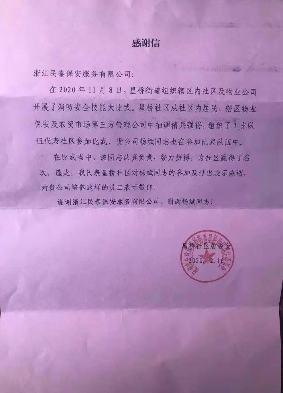 12月16日,浙江民泰星桥农贸市场项目收到一封星桥社区居委会送来的表扬信,信中对在消防安全技能大比武中表现优秀的杨斌提出特别表扬。